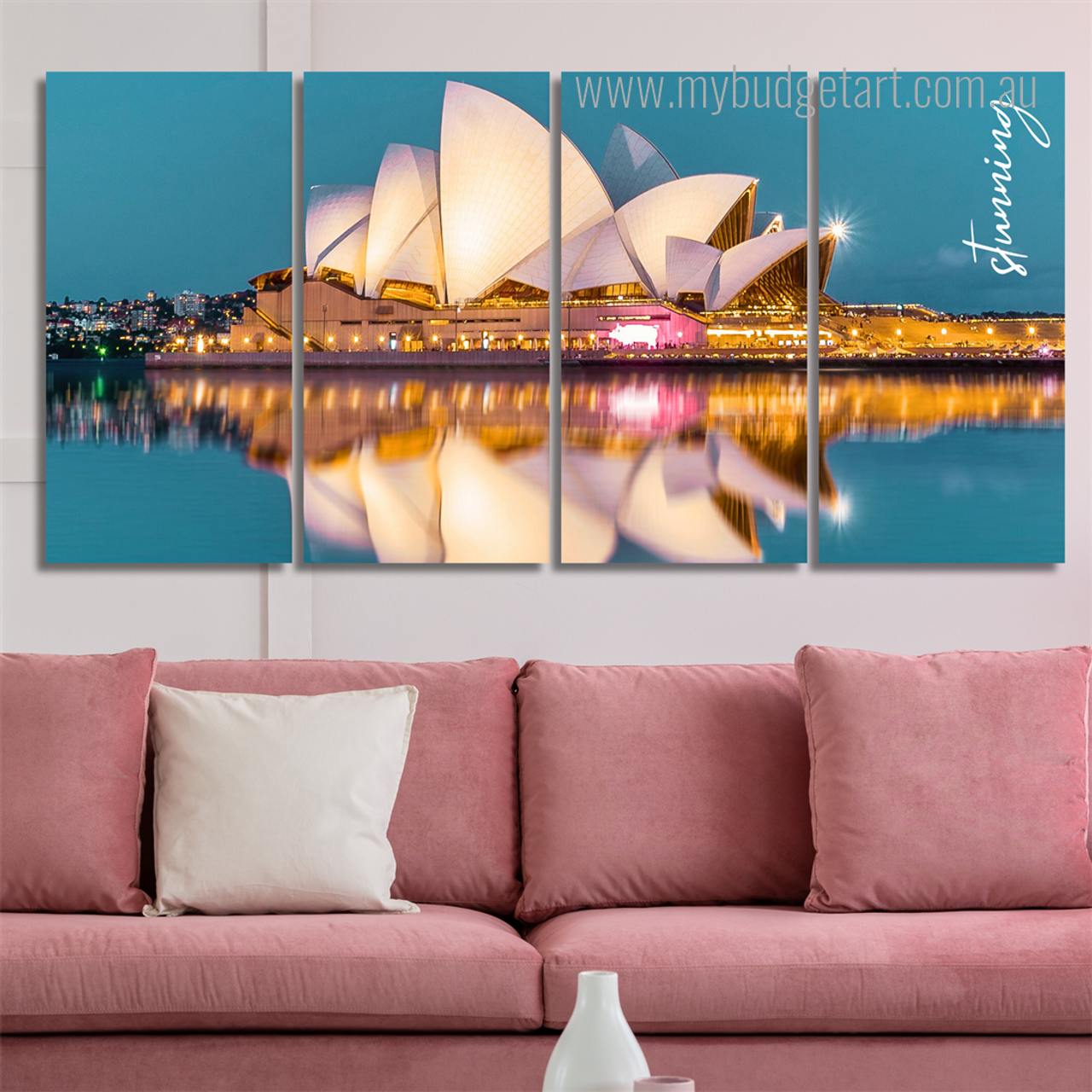 Transform your dining space with this stunning four-piece canvas art set. It beautifully captures the Sydney Opera House at night, with sparkling lights reflecting on the river and a touch of stunning typography. This modern collection is available as ready-to-hang stretched canvas, or as rolled prints for custom framing, offering a stylish Australian-inspired focal point.