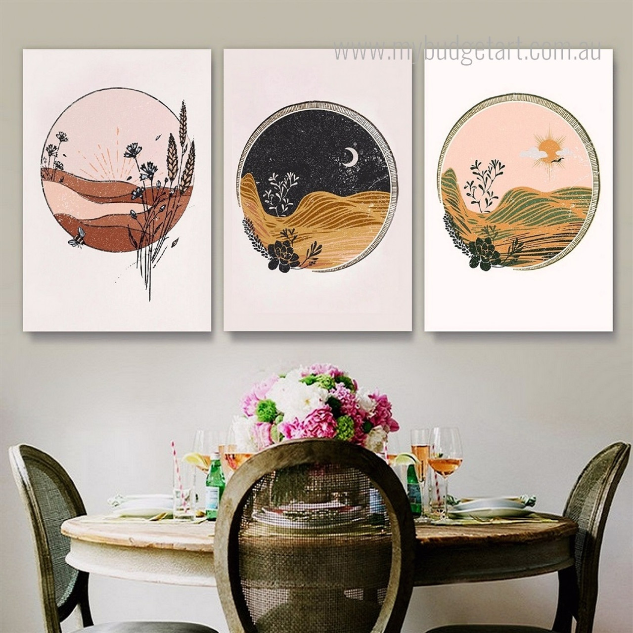 Experience serene balance with this Scandinavian minimalist landscape. Featuring abstract elements like land, leaves, flowers, sun, moon, and birds, it beautifully captures the essence of day and night. Buy this nature canvas print as a single piece or a statement 3-piece multi-panel triptych for harmonious wall décor.